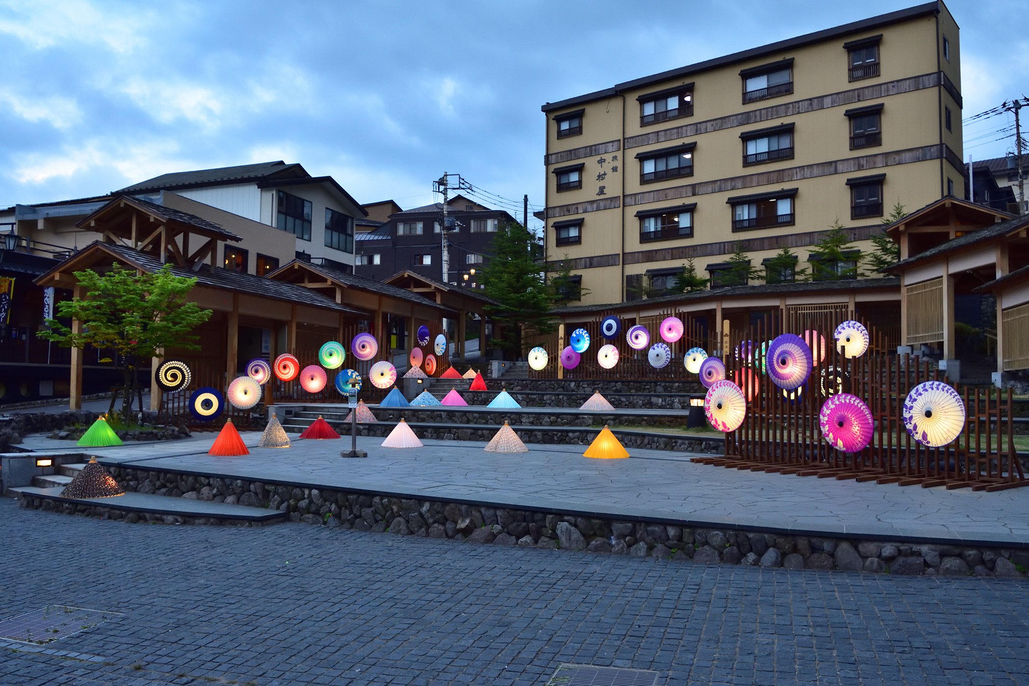 「和傘」の照明オブジェが湯路広場を彩ります。